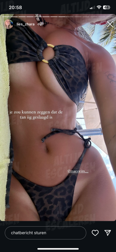 Wat doe je als influencer op vakantie? Precies! Bijkleuren in de zon. Zo ook onze Lies! Ze staat natuurlijk bekend om haar mooie figuur en dat deelt ze graag met ons. Ze is nu zeer actief op Snapchat, maar ook op Instagram deelt ze het een en ander. Zo liet ze zien hoeveel ze verkleurd is op vakantie. Hoe ze dat deed? Dat zie je hieronder.